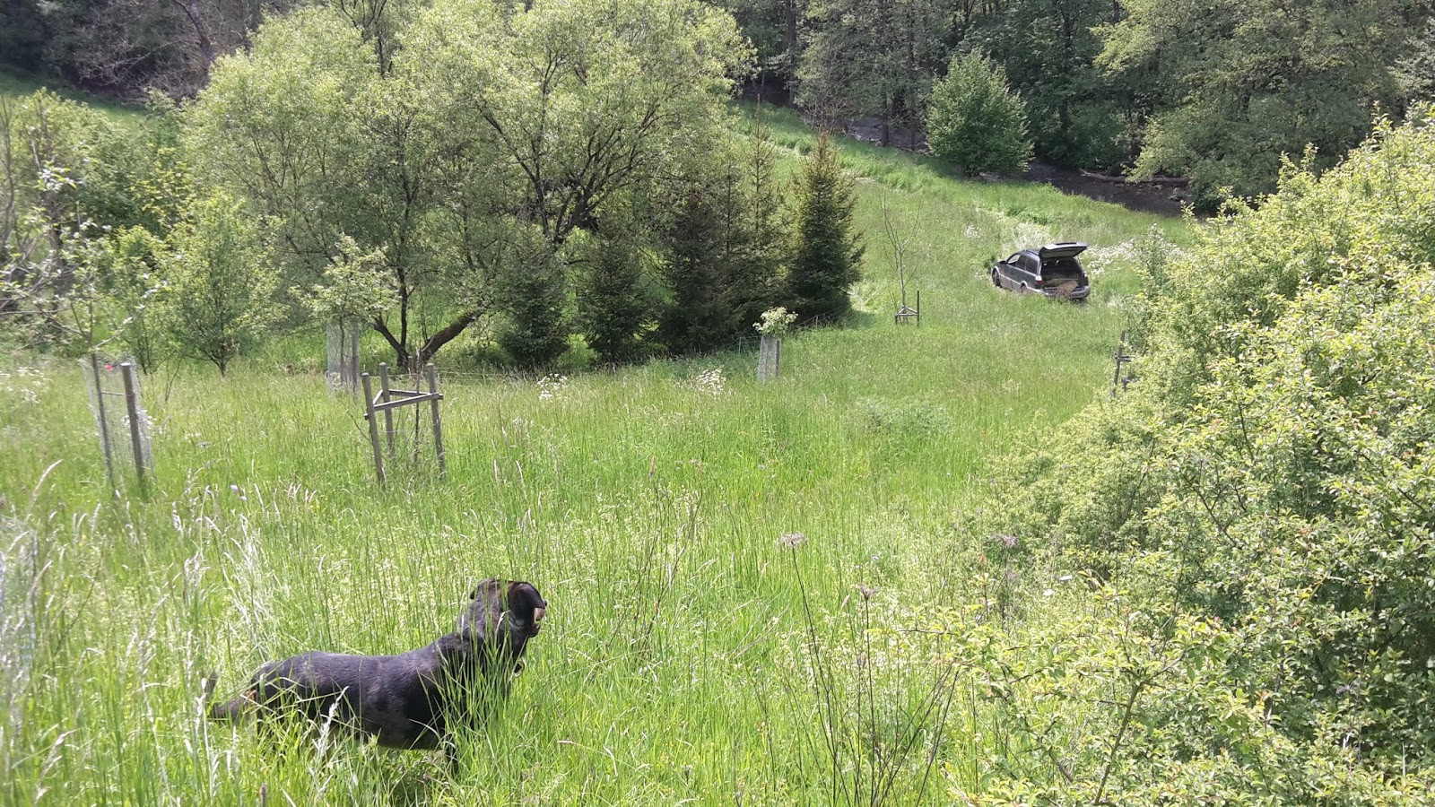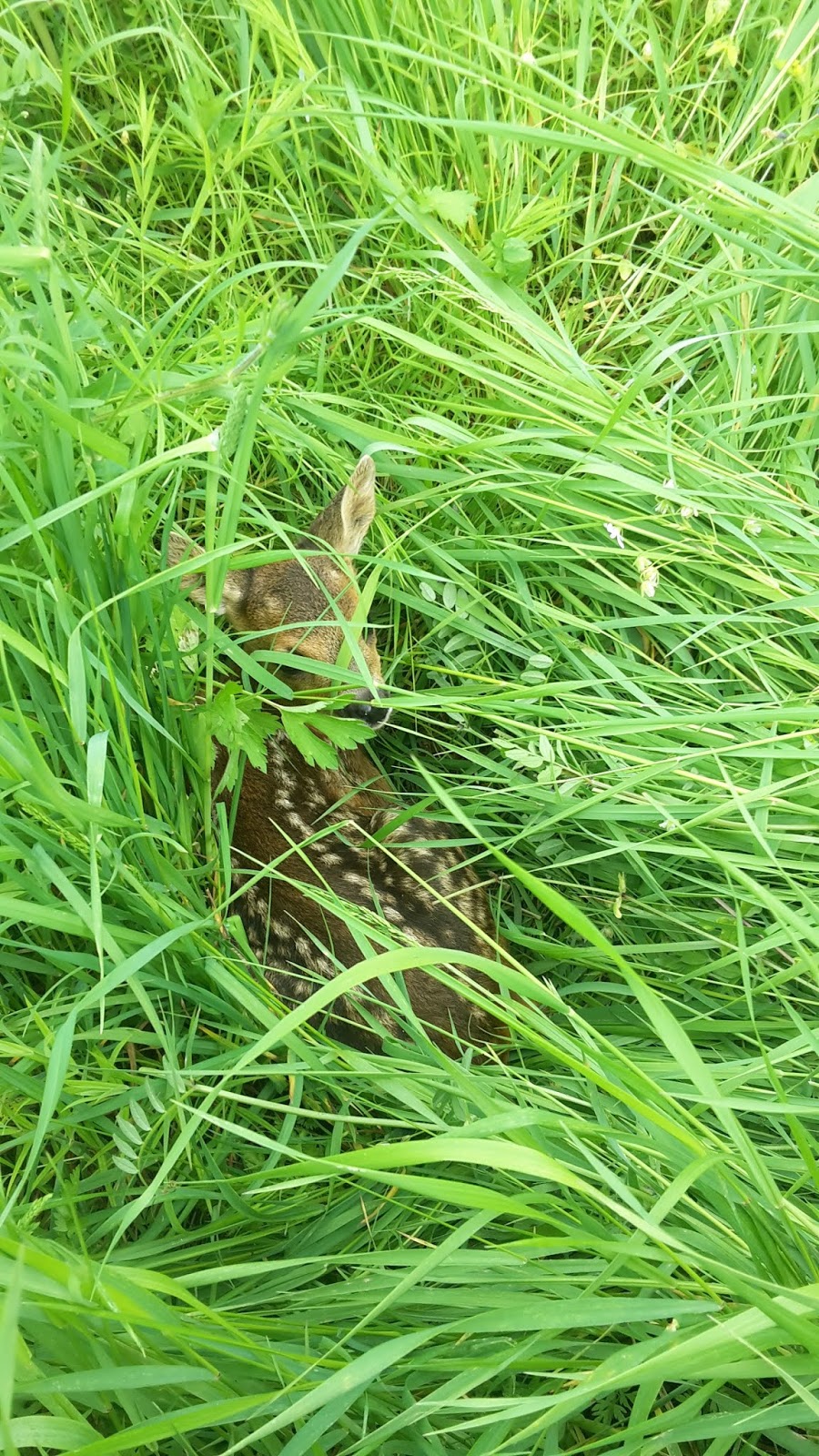 Und einmal ein Rehkitz. Da lasse ich den Zaun offen. Die Mutter holt es ab, wenn Hunde und ich fort sind.